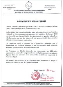 La Présidente du conseil de l’ordre des opticiens, Solange Douanla, a signé un communiqué radio- presse pour annoncer la disponibilité du répertoire des opticiens autoriser à exercer sur le territoire camerounais en 2025, en date du 17 septembre 2025 à Yaoundé. Lire en exclusivité cette importante communication du conseil de cet ordre.